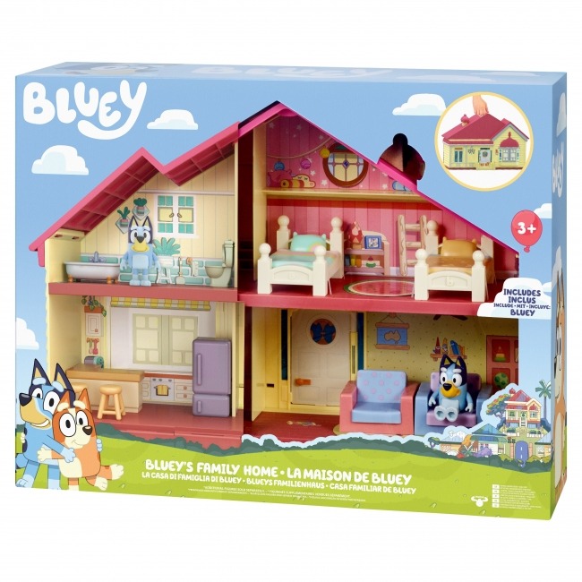 Recreate some of the most memorable moments from the show in the Bluey Family Home playset! Big in size and features, this enormous toy playset is full moulded details with opening doors. and a large wall panel that pulls down to form an amazing outdoor patio! There is plenty of space for Bluey and her family to play in with four different rooms - a living room, kitchen, bedroom and bathroom. With many pieces of removable furniture including 2 beds, 2 stools, 2 sofas, 2 rugs, a bathtub, toilet, dining room counter and fridge, there is plenty to do in this beautiful home! Add more fun to the home with the whole family by collecting Bluey Family 4 Pack (sold separately).