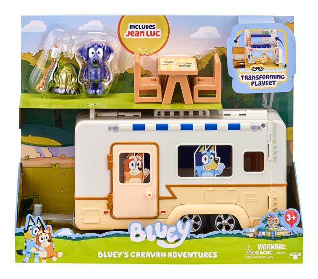Hit the road for a vacation with Bluey's Caravan Adventures Playset. Kids will love using this fun-filled playset to recreate some of the most memorable moments from the show's camping episode and make up new adventures with their Bluey toys. There's room for the whole family in this transforming Bluey campervan playset: fold up the roof to reveal a second story and cozy bunk beds. Flip out the back of the van to open up the kitchen. What's cooking in the oven? Open it up and see! This Bluey campervan set includes one Jean Luc 2.5" figure with moving arms and body. Sit your figures in the chairs around the table and get ready for dinner, or toast a marshmallow over the campfire, or customize the caravan with the fun stickers supplied. This Bluey playset has 7 pieces to play with and is compatible with the Healer 4WD Family Vehicle (sold separately). Hook it up to the caravan and pull it along as you hit the highway on a road trip.
