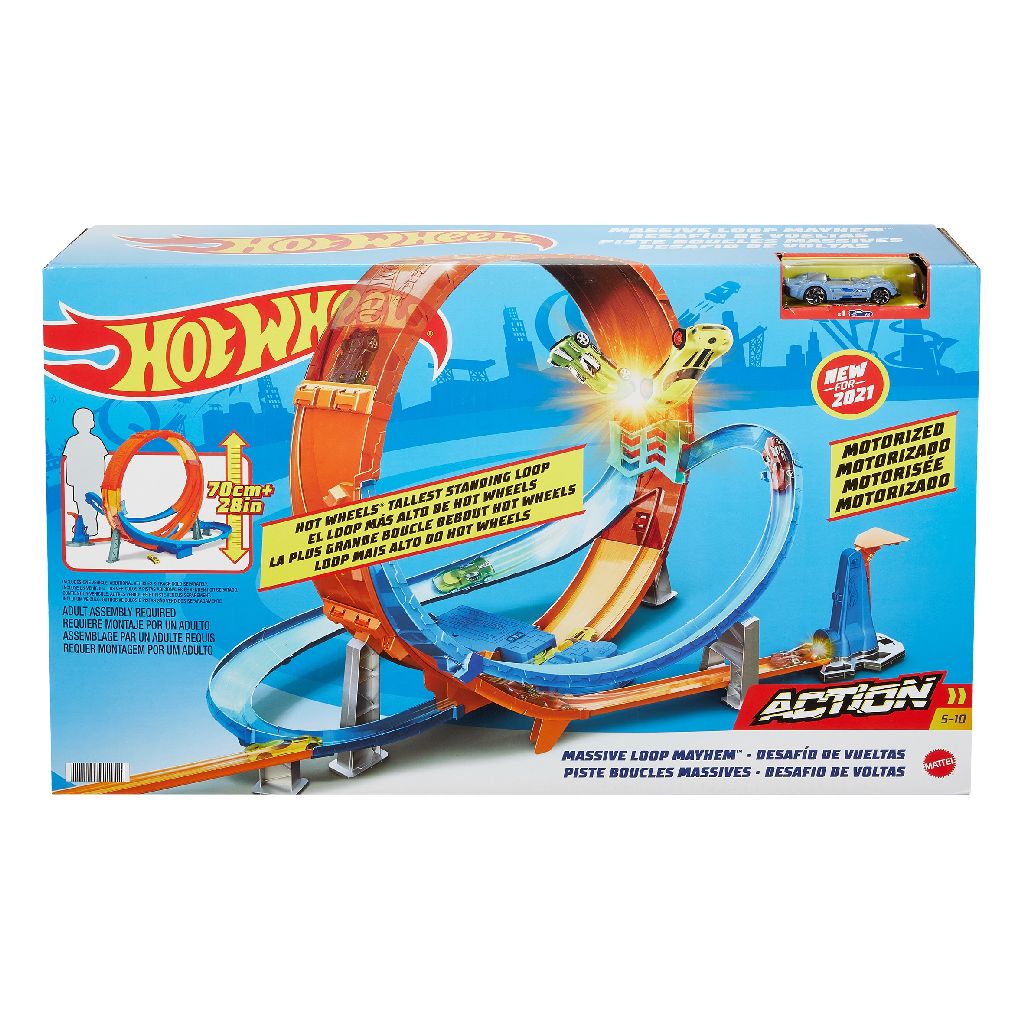 ?The Hot Wheels Massive Loop Mayhem track set will definitely make kids loopy from the thrilling excitement! This epic track includes a huge 28-inch wide loop that's designed for multi-car play -- vehicles whip around the loop and avoid nail-biting near-misses with each other! Kids send the first car into action using the slam launcher, then add more and more cars until there's the inevitable crash (additional cars sold separately). The challenge lies in how many cars can run at once -- it's a trick of timing and skill. The track loop collapses for easy storage and comes with one 1:64 scale Hot Wheels vehicle to get the action started! colours and decorations may vary.