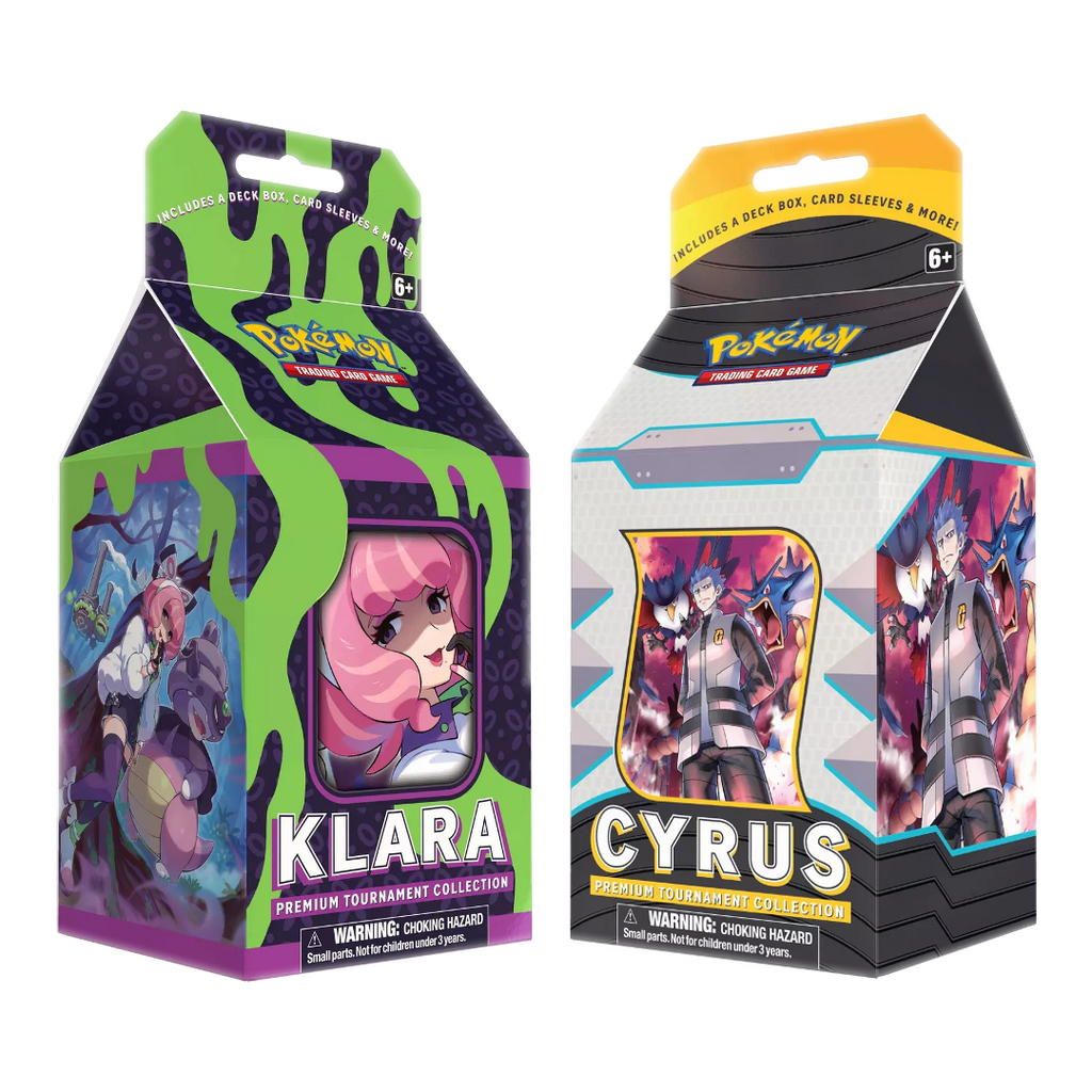 Join forces with Team Galactic's brooding leader Cyrus—a master manipulator who disrupts your opponent's finely tuned plans with his ruthless Boss's Orders, a card that allows you to switch one of their Benched Pokémon into the Active Spot for battle. Or choose the aspiring pop star Klara, who allows you to retrieve up to two Pokémon and two basic Energy cards from your discard pile.