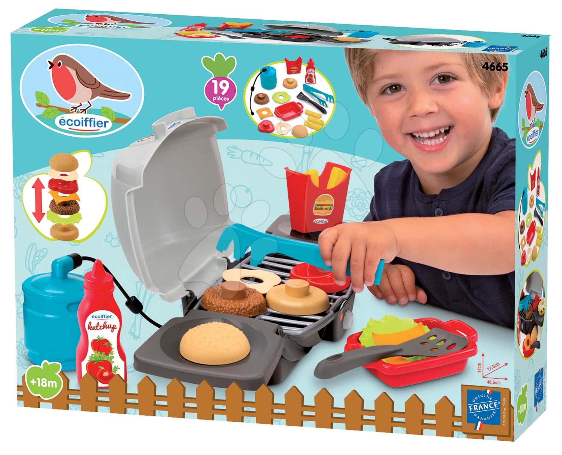 portable "gas" barbecue A -A the child can easily move the toy anywhere, - has a grill, half of which is a convenient tray and a grill cover, - the set includes up to 19 accessories, - the kit includes, among other things, hamburger, fries, ketchup, barbecue tongs, imitation gas cylinder, - a product intended for children over 18 months.