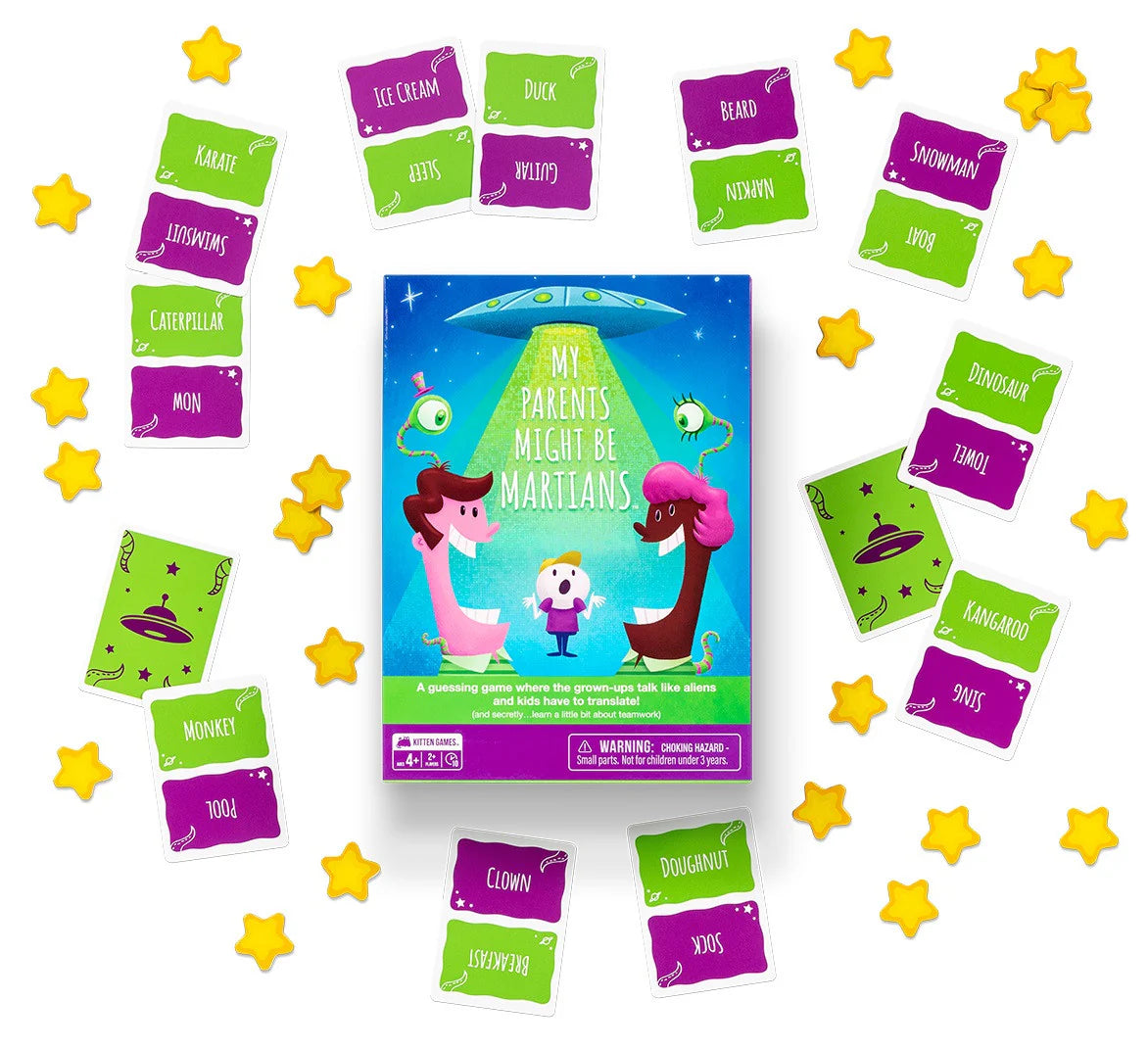 The kids are Human, the grown-ups are Martians, and everyone’s laughing! The goal is for the Martians to get their Human friends to guess a word by only using clues with single-syllable words. The Humans have to work together to make sense of your silly speech before the timer runs out. This game is an out-of-this-world way to improve your little ones’ teamwork and language skills. Perfect for small family game nights or breaking the ice at big gatherings. My Parents Might Be Martians comes with: · 150 Kid-Focused Cards · 1 Sand Timer · 36 Point Tokens · 1 Megaphone
