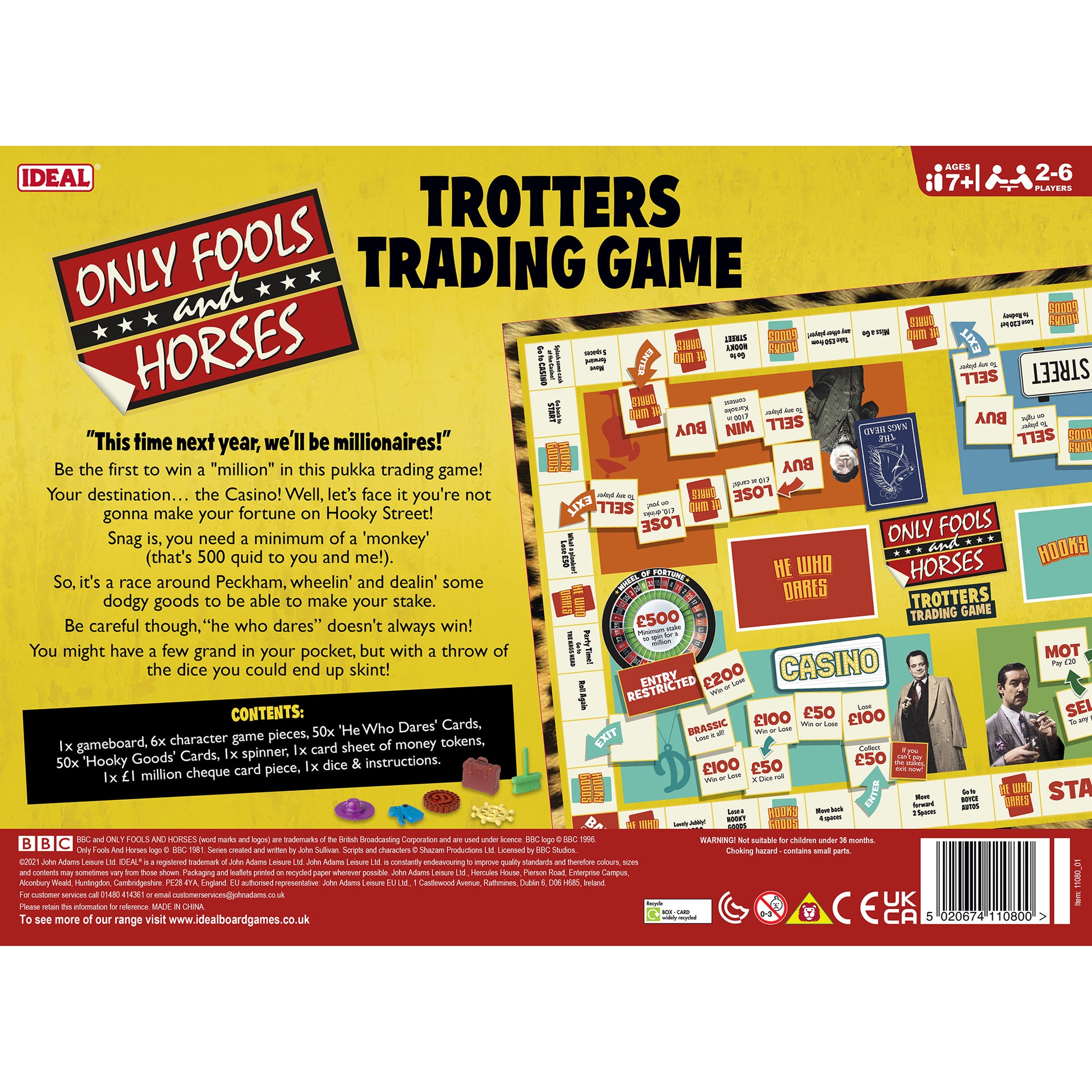 “This time next year we’ll all be millionaires!!” Be the first to win a “million” in this pukka trading game! Your destination….the Casino….well lets face it you’re not gonna make your fortune on Hookey Street! Snag is, you need a minimum of a ‘monkey’ (that’s 500 quid to you and me!) So it’s a race around Peckham, wheelin’ and dealin’ some dodgy goods to be able to make your stake. Be careful though ‘he who dares’ doesn’t always win! You might have a few grand in your pocket, but with a throw of the dice you could end up skint!