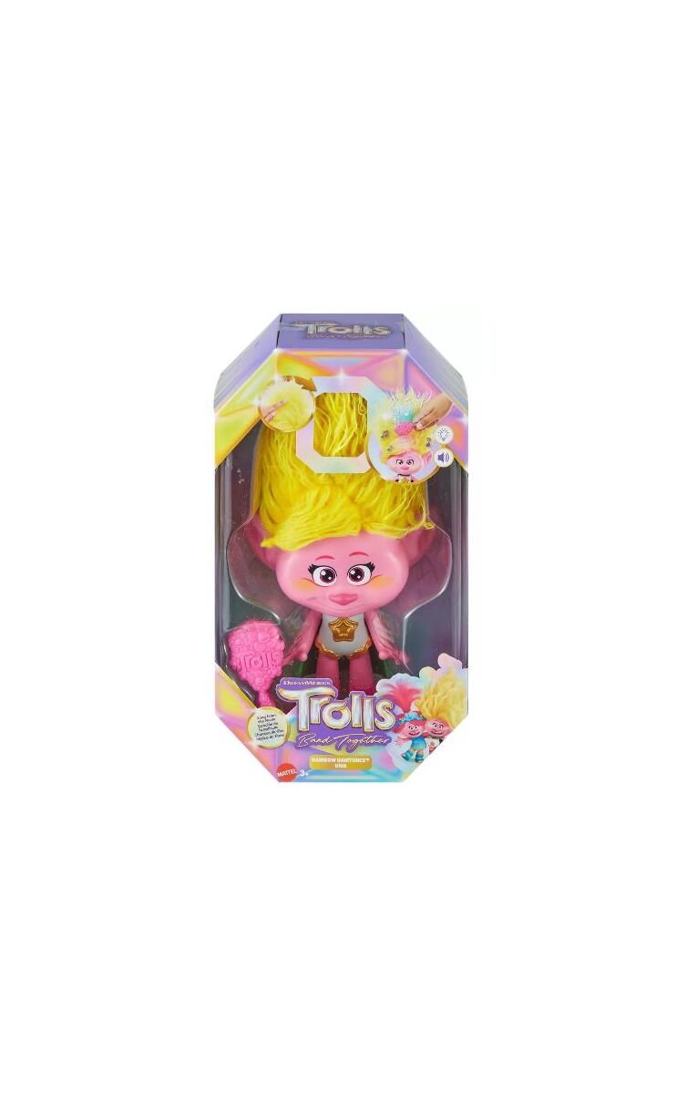 Rainbow HairTunes Viva Singing Doll is inspired by DreamWorks Trolls Band Together Movie. Viva has light-up hair, music, and phrases. Simply run the included brush through the doll’s hair to start the party! With every stroke of the brush, different sounds will play and lights in the hair will glow. Rainbow HairTunes Viva doll also has a removable cape accessory to add to the storytelling fun.